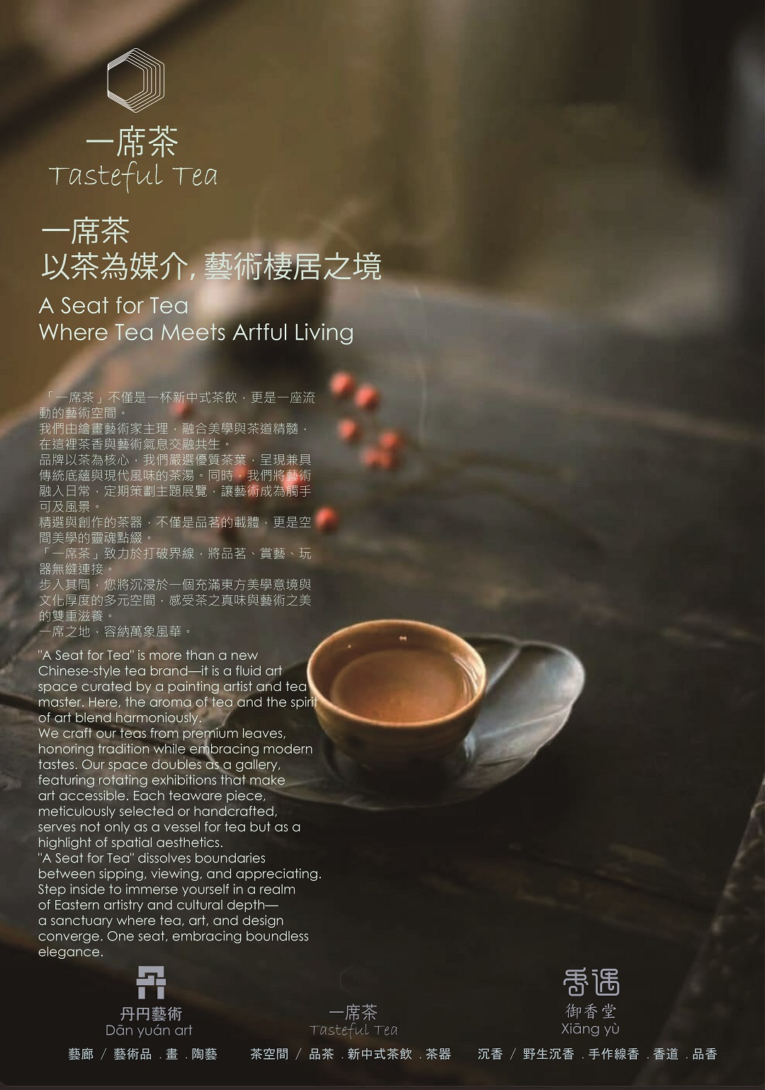 一位畢生摯愛繪畫的藝術家,在畫布上追尋創作的數十年間,始終有茶香相伴。他深信,喝茶與作畫一樣,都是生命的藝術。為了將這份古老的儀式融入當代節奏,我們專程前往台灣優質茶區,尋找無農藥殘留的純淨茶園,訂製專屬於「一席茶」的高端優質原茶 並耗費多年光陰,潛心鑽研新中式萃茶技藝,只為保留茶湯最純粹的靈魂,同時賦予它符合現代生活的優雅形態。